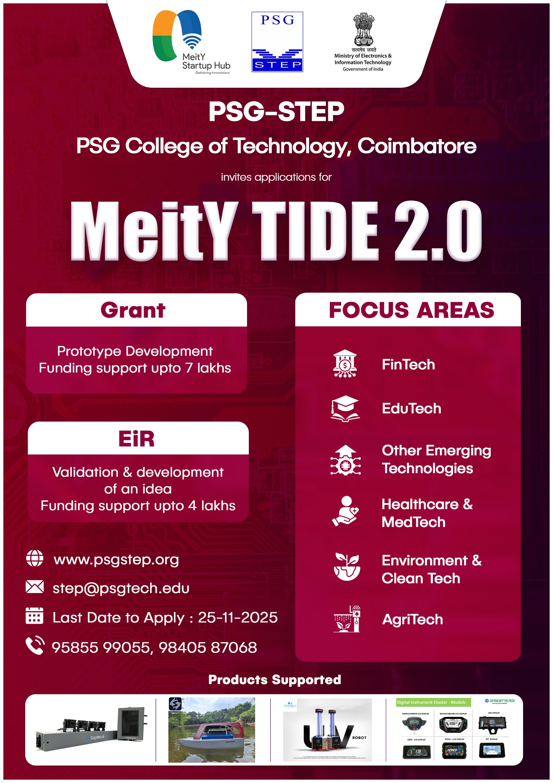 PSG-STEP is proud to be associated with the Ministry of Electronics & Information Technology [MeitY], Govt. of India under TIDE 2.0 [Technology Incubation & Development of Entrepreneurs].